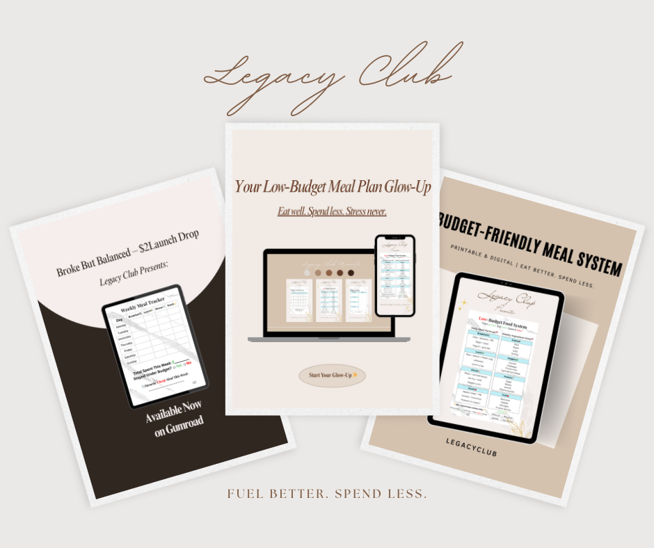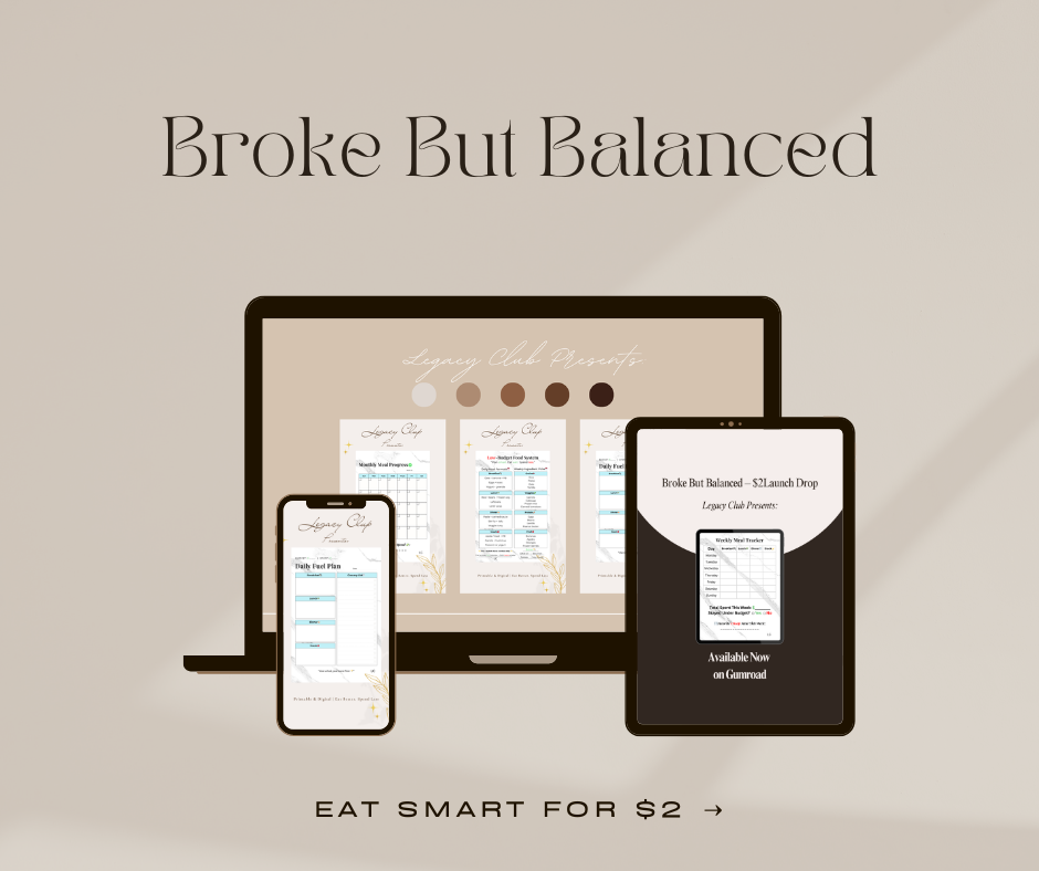 budget meal planner, broke but balanced, weekly meal planning, healthy eating guide, grocery list printable, digital planner PDF, food budget tracker, Legacy Club, affordable meal system